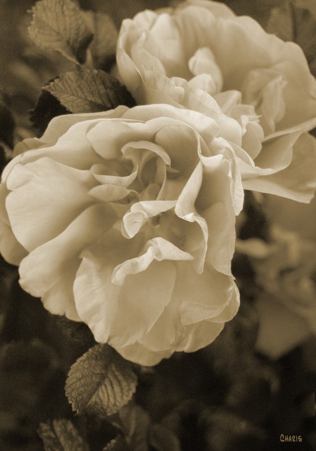 The roses I photographed yesterday will be blown next week. A photo-shopped sepia memory exists, and now that I’ve posted it may be flung out into cyberspace in perpetuity. It’s not exactly how they looked (they were actually softy pink) but they are recognizable as roses –and they have taught me something.