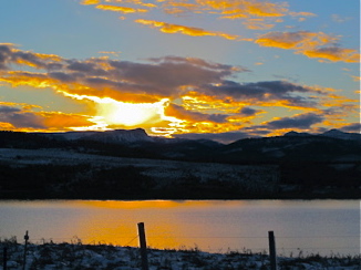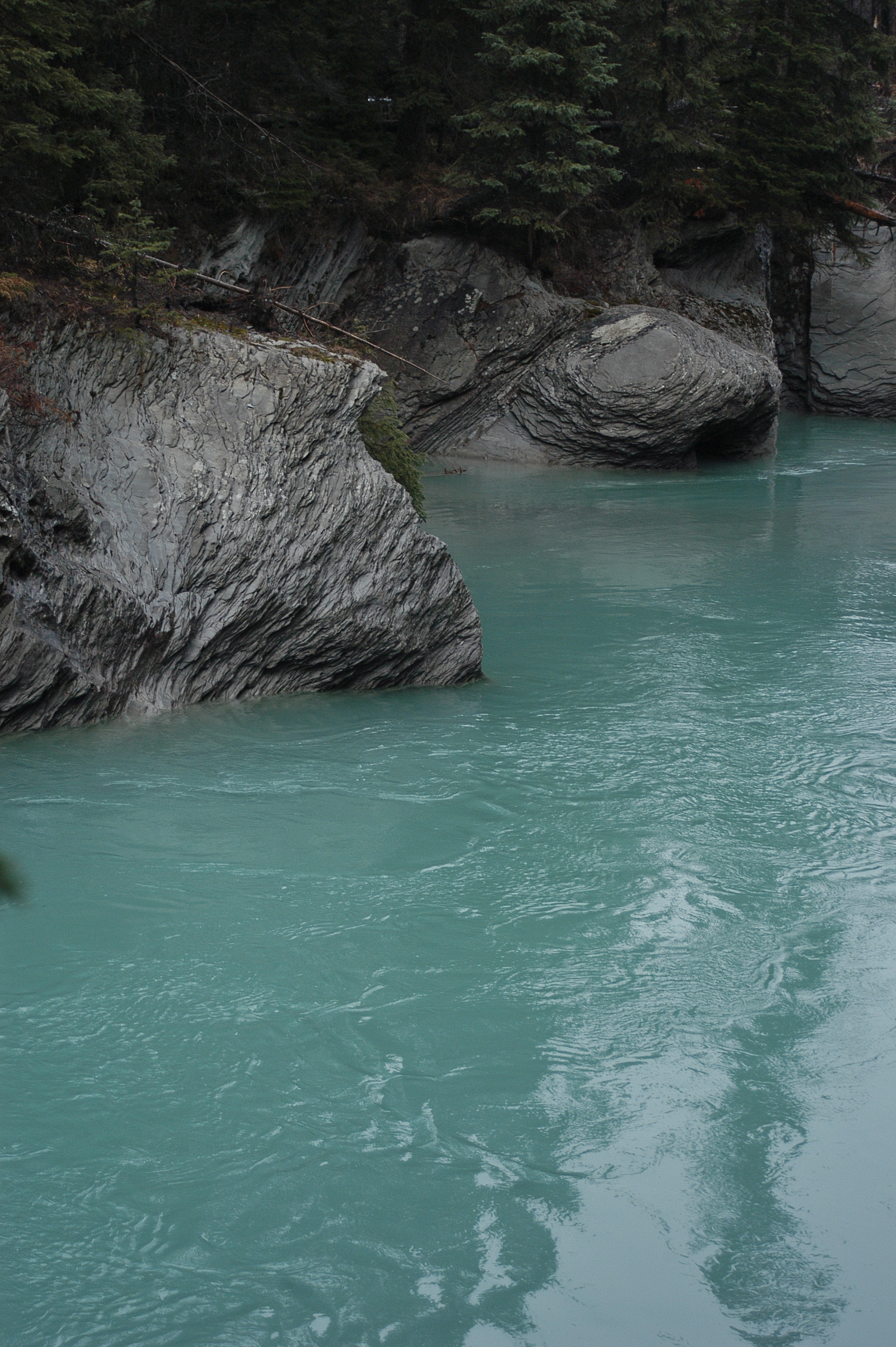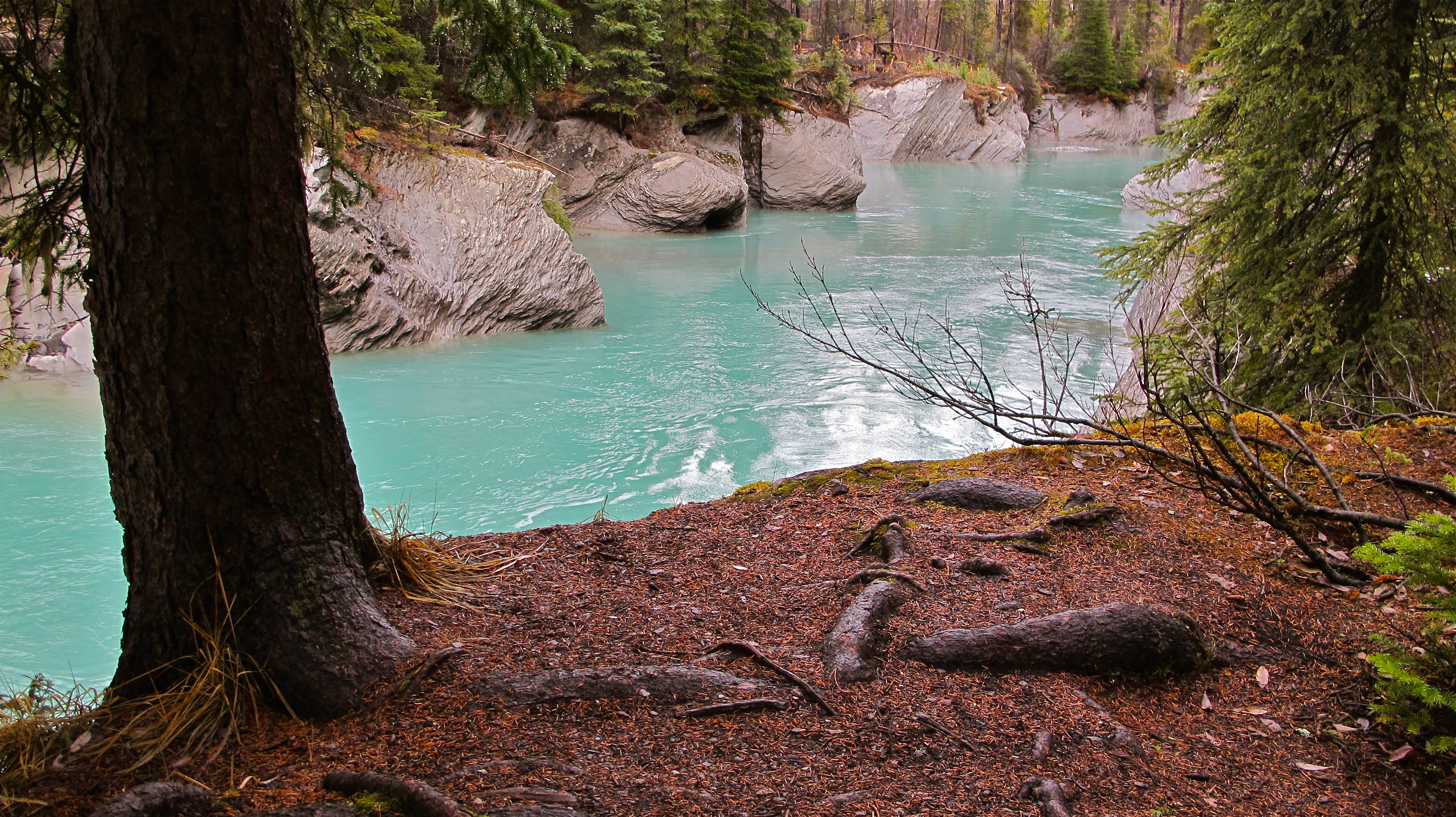 I was looking forward to this journey to my Father’s house on the Alberta side of the Rockies. Usually the mountain views are stunning, but instead I drove through fog for nearly four hours. I could see very little beyond the verge by the highway most of the time. Sometimes the fog would lift for a moment only to re-form and descend again. I stopped near some cabins, closed for the season, to take a break from the tension of driving in poor visibility and found a beautiful stream. When I descended the Kootenay Parkway the clouds vanished.