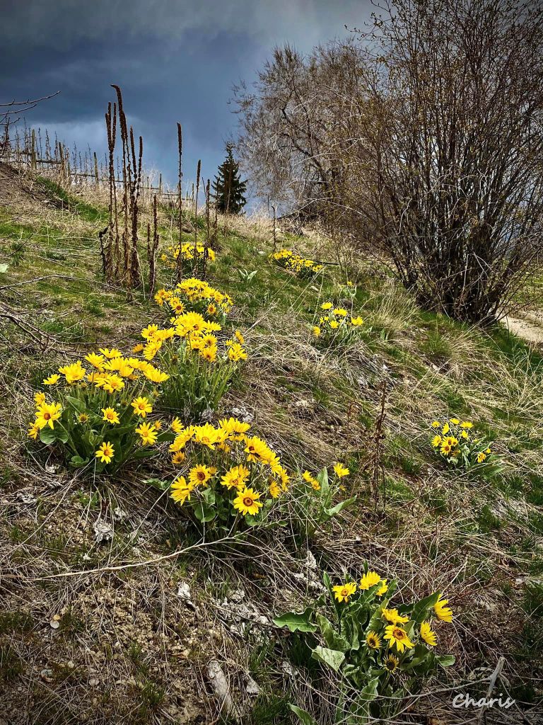 One of the first wild flowers to bloom in the drier parts of British Columbia is Balsam Root. I saw these bright yellow blossoms on a hill basking in the sun, but it was hard to get there. I went looking for some I could get closer to, but very few were blooming elsewhere yet. Instead I went to a garden shop and took photos of flowers that are too fragile to plant outside yet. They were very pretty, but there is something special about the wild ones.